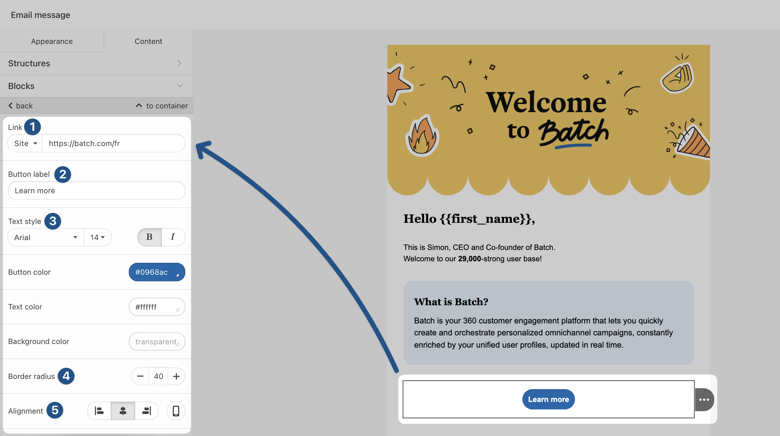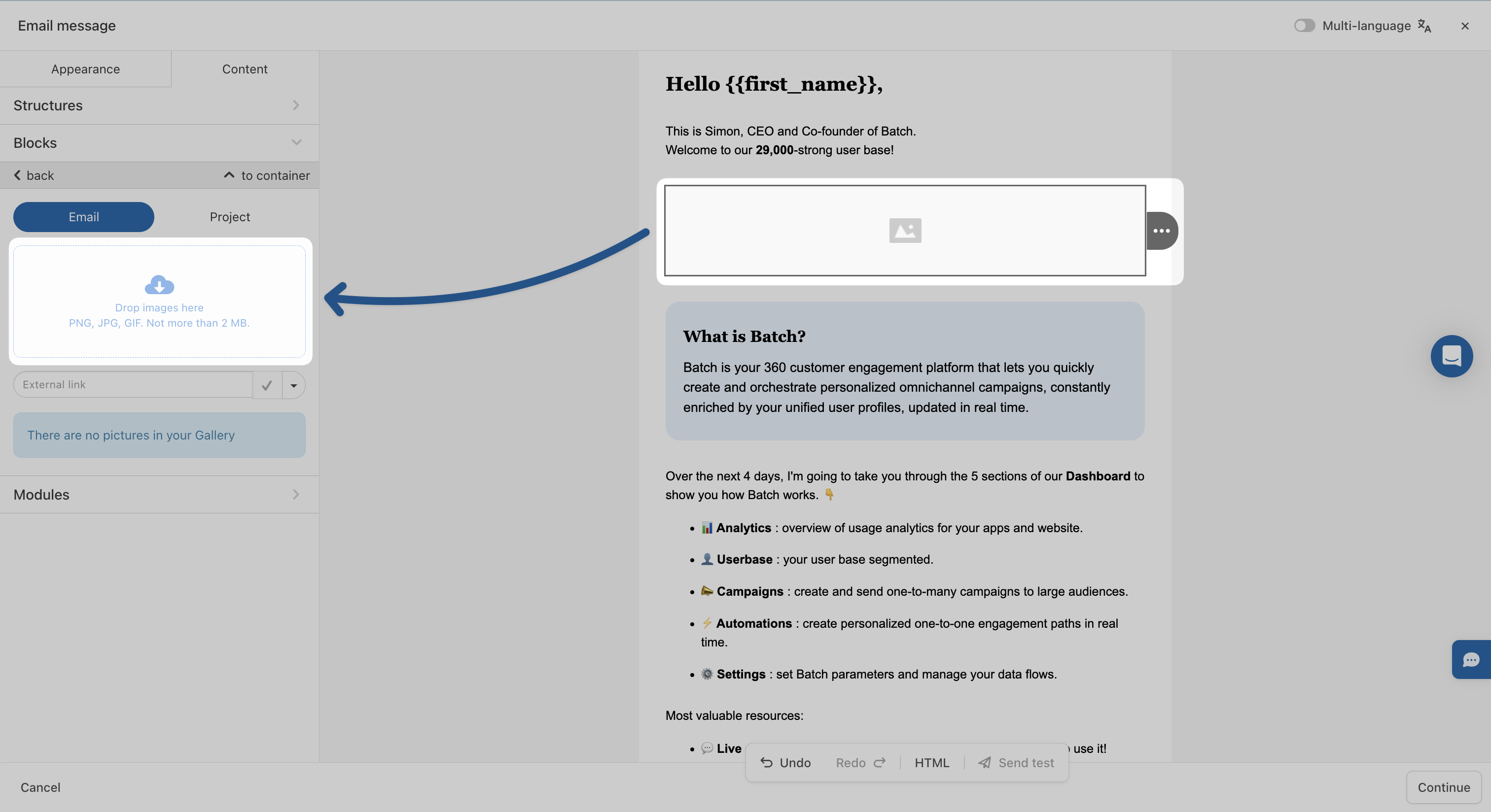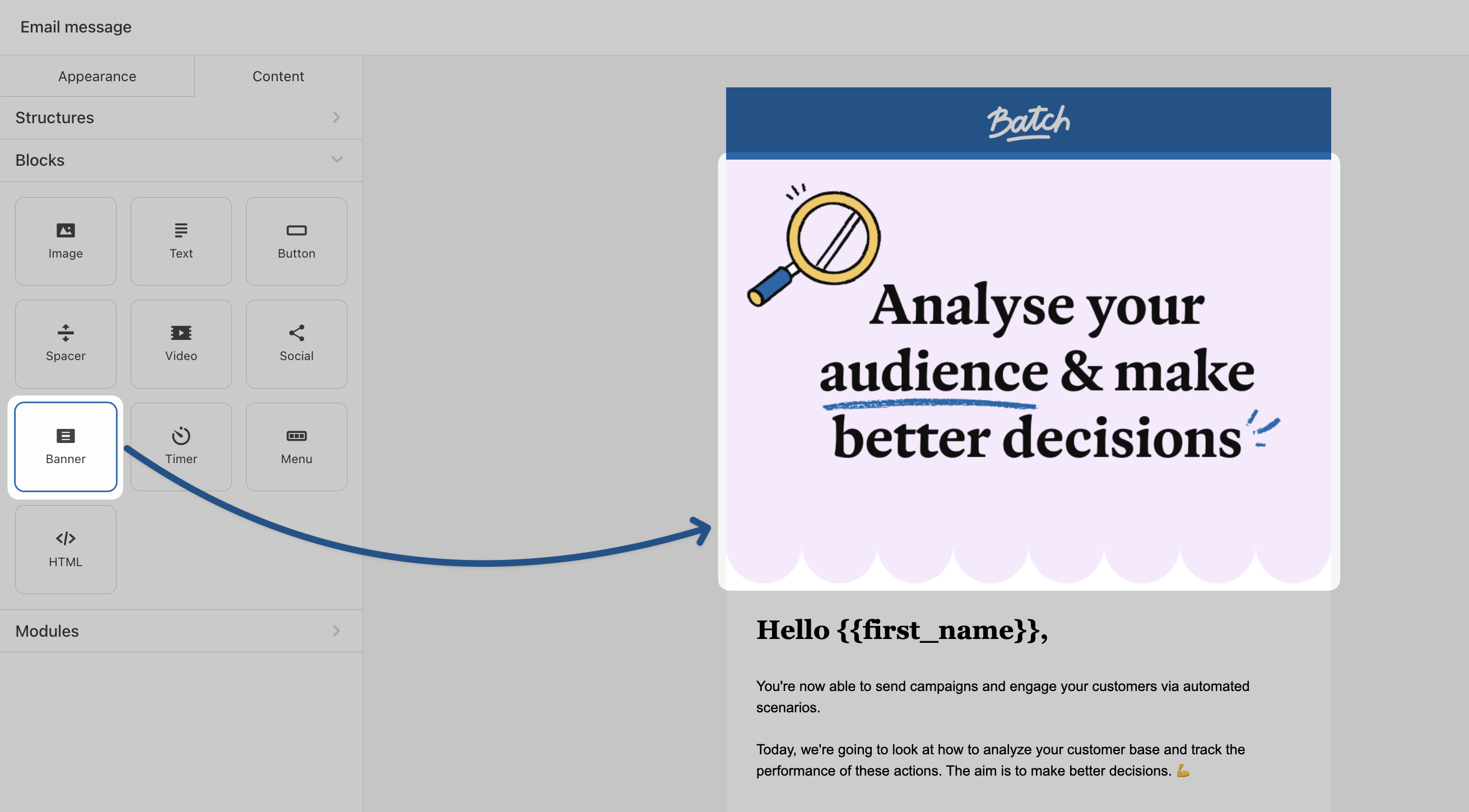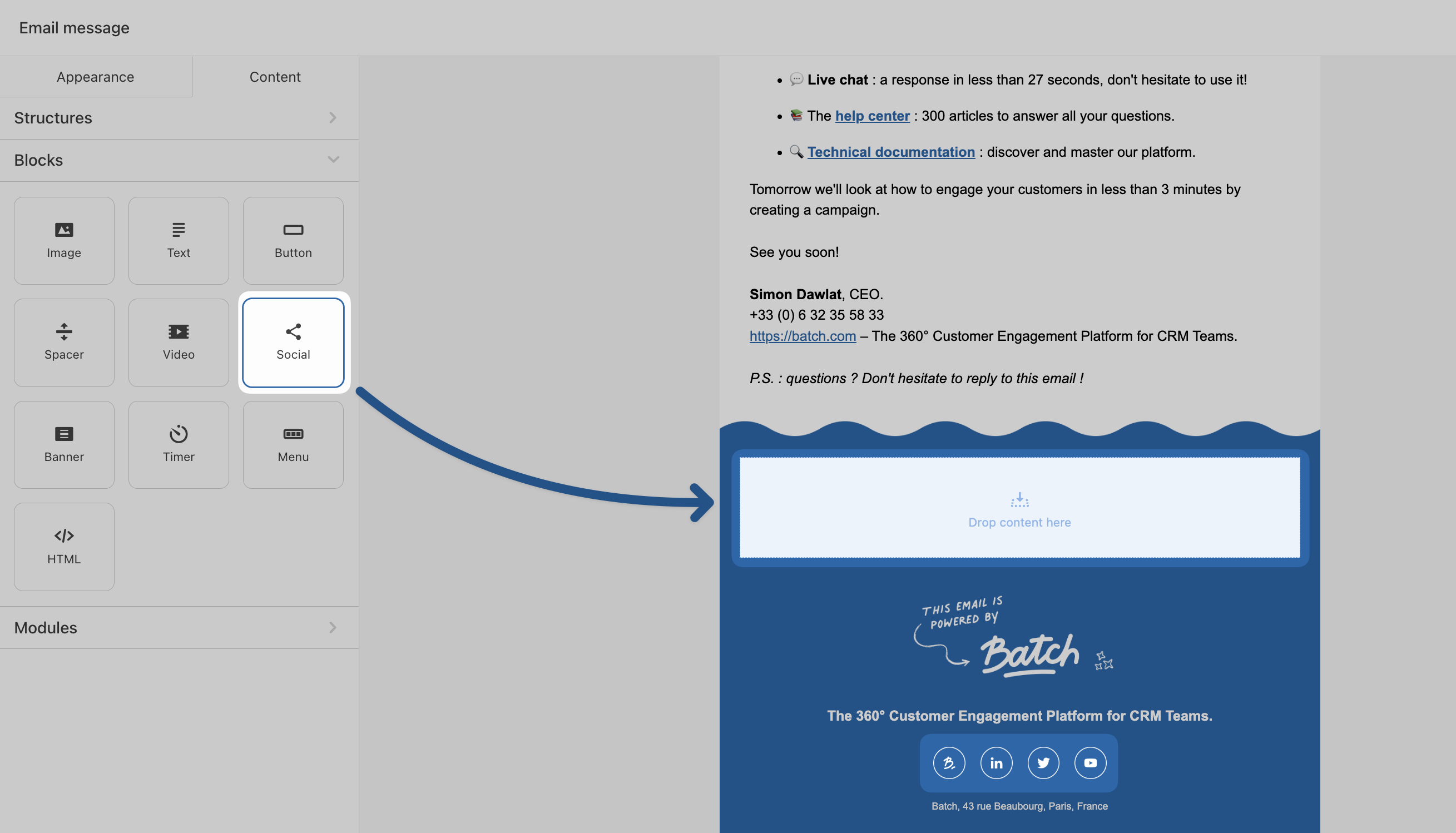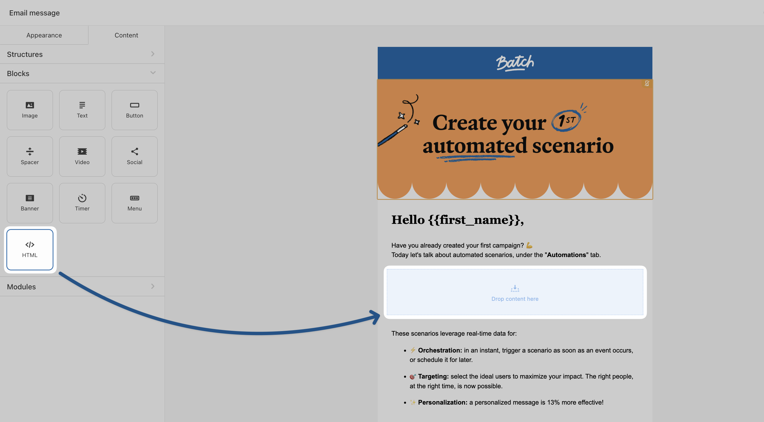 Once saved, you can quickly drag and drop these modules into future templates, keeping your emails consistent and efficient to build. Here is [how to save modules on the email composer?](https://doc.batch.com/guides-and-best-practices/message/email/how-to-save-modules-on-the-email-composer)<br>