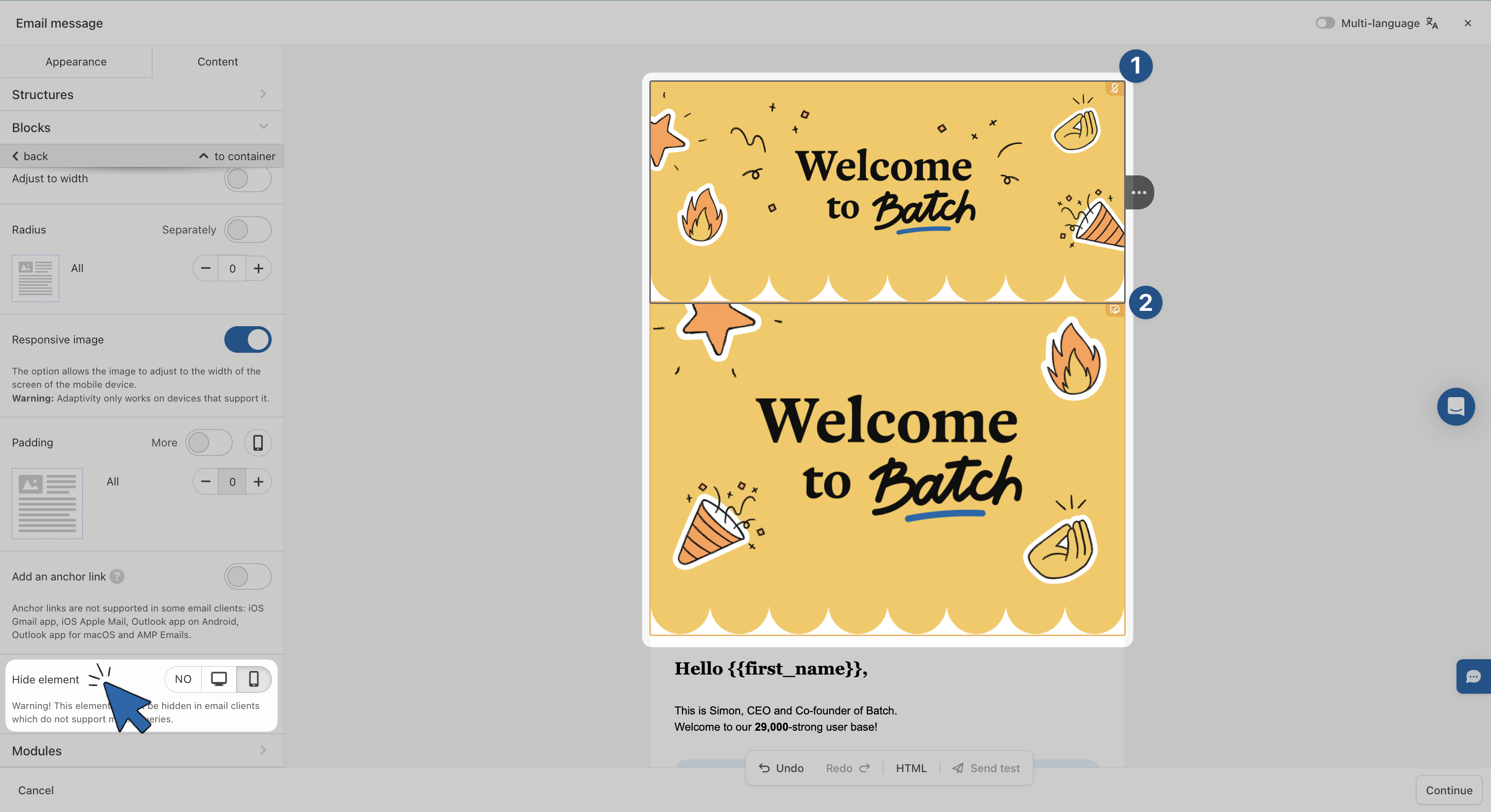 All emails built with Batch are responsive by default. This means they automatically adapt to mobile screens. But for full control over how your content appears on smaller devices, you can customize certain settings specifically for mobile.