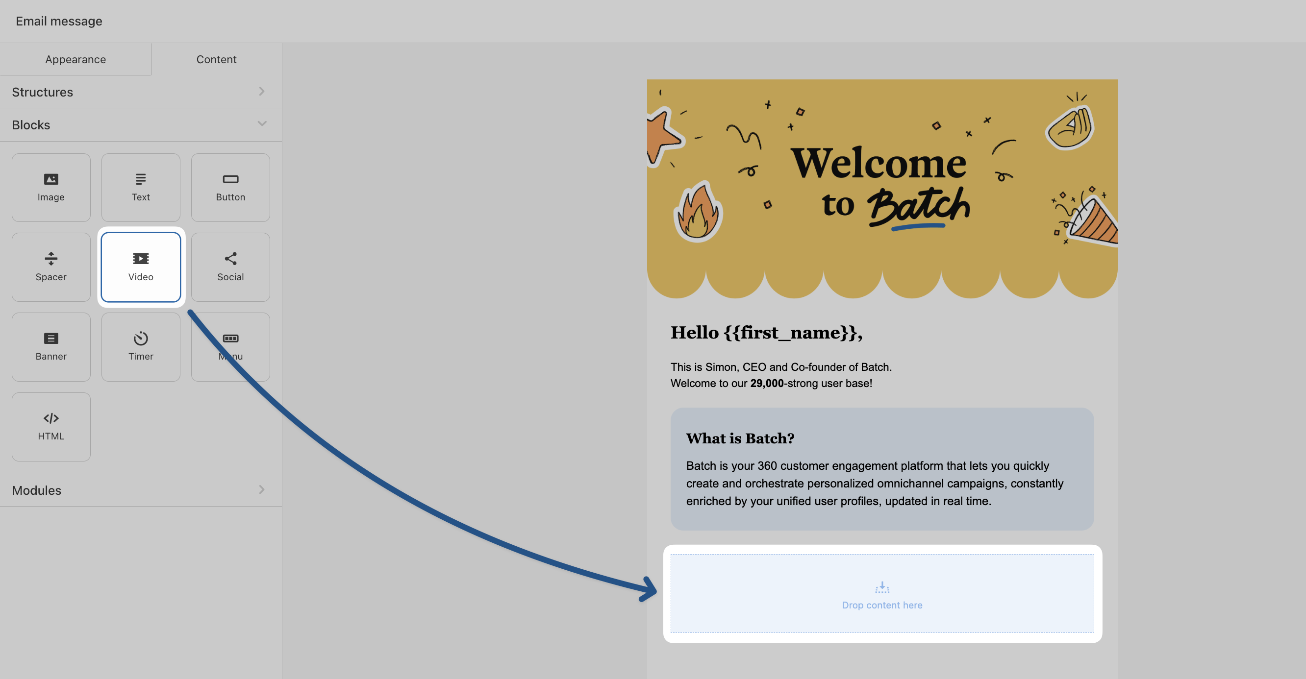 Want to make your emails more dynamic and engaging? Adding videos to your email is a great way to capture attention and increase interaction. Whether you’re showcasing a product demo, a testimonial, or event highlights, [adding videos in your Batch email template](https://doc.batch.com/guides-and-best-practices/message/email/how-to-add-a-video-to-your-email) is quick and easy.