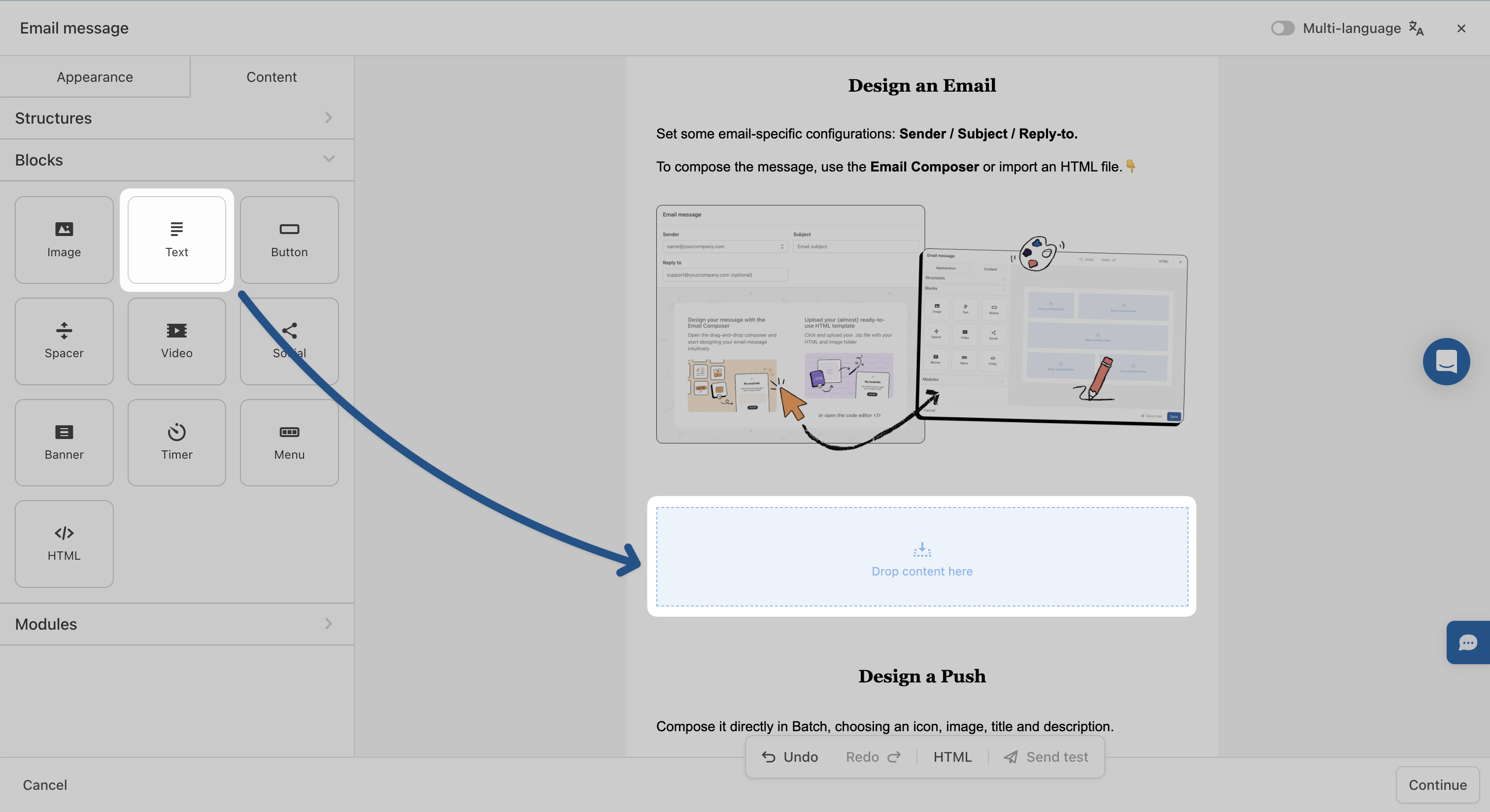 Blocks are the **foundation** of your email layout—they’re the most granular elements you’ll work with in Batch. In the **Content → Blocks** menu, you have access to **13 essential blocks** such as: