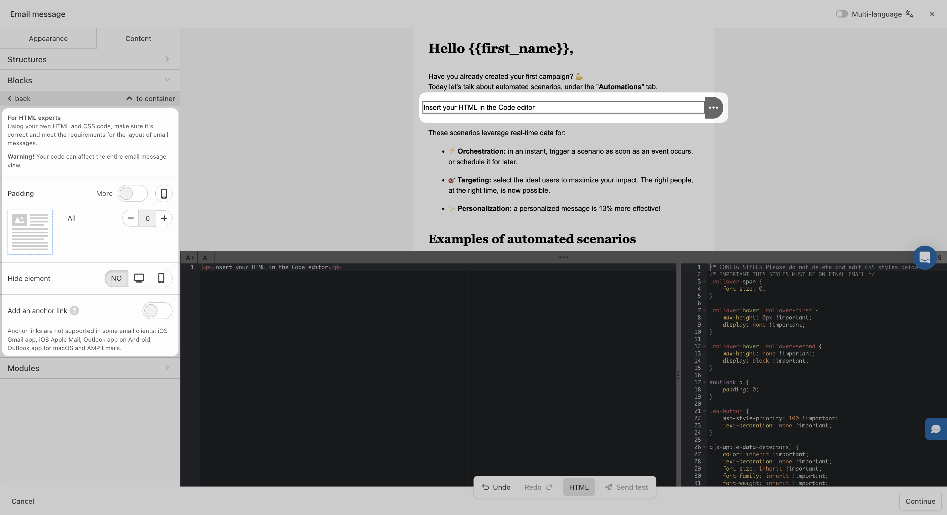 Sometimes, your email design might require specific features or layouts that go beyond what the visual editor offers. In these cases, you can easily insert your own **custom HTML** code into your Batch template.