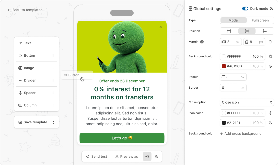 You can configure a dark mode version for each In-App template to match user device settings. With dark mode enabled, you can specify separate color values for light and dark themes. Each mode can be previewed directly within the In-App composer.