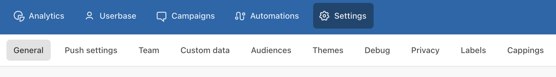 * [**Push Settings**](#push-settings): Edit all your push-related settings (e.g. iOS push certificate, FCM settings, delivery speed limit, etc).