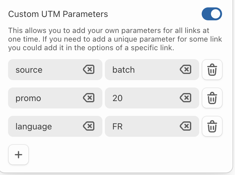 Batch allows you to define URL parameters at the email level. These parameters can be used either as standard UTM parameters or as fully custom query parameters (with any key and value), and are automatically appended to every link in the email.