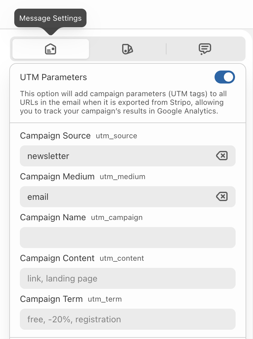 URL parameters are configured once from the email composer, in the **Message settings** tab, and then applied to all links included in the email content (text links, buttons, etc.), except for the Batch unsubscribe link (`{{emailComposerUnsubscribeLink()}}`).